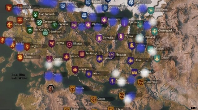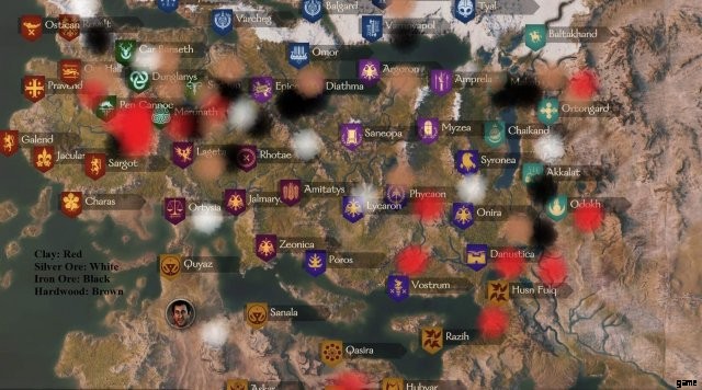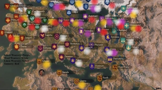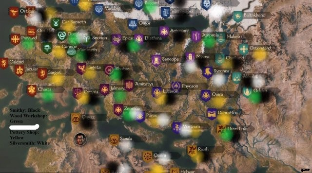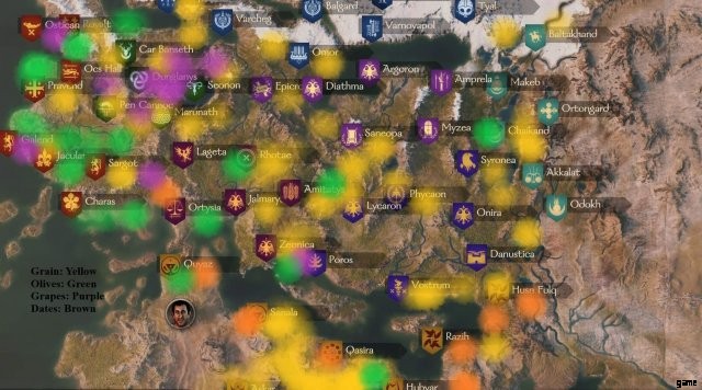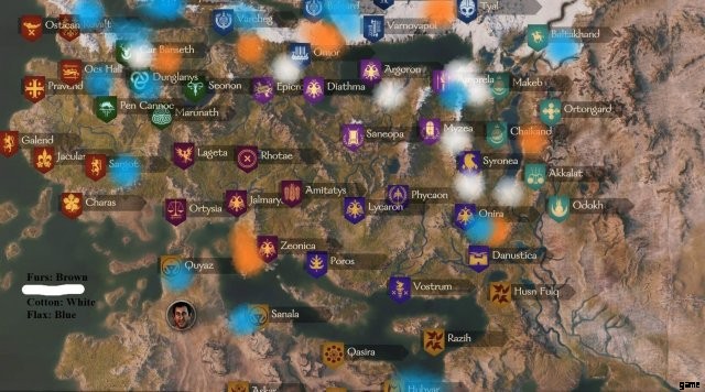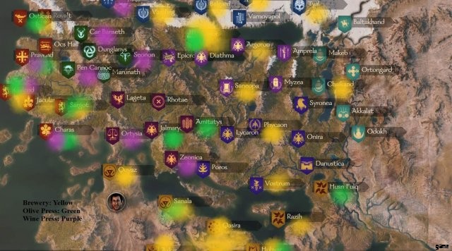 マップには、各アイテムが州ごとにどこで生産されているか、またはどの都市がどのアイテムを製造しているかが表示されます。プロヴィンスとは、町とそれに隣接する村、または城とそれに隣接する村のいずれかです。表示されている注文は、入力された基本商品であり、該当する場合は製造商品です。