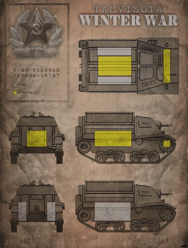 T-20 のエンジンは車両中央の乗客セクションの下にあります。両側に燃料タンクが隣接しています。パッセンジャー下部へのサイドヒットは非常に致命的です。トランスミッションは乗組員の足元で前輪を通過します。