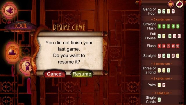 メニュー (左上) を使用して、ハンドの開始時にプレイしている現在のハンドを終了します。終了したばかりのゲームの再開に関するメッセージが表示されます。 [キャンセル] または [再開] をクリックせずに、左上の [戻る] ボタンをクリックしてメニューに戻ります。戻ると、中断したところからゲームを続けることができます。