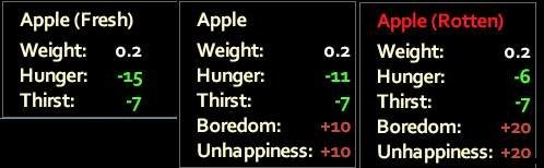 新鮮で古くなったものしか安全に食べられないことに気付くでしょうが、古い食べ物には+10の退屈と+10の不幸があります.腐った食べ物の場合はさらに悪いです(そしてそれはあなたを病気にする可能性があります).これが、謙虚なサラダボウルの出番です。古くなったリンゴをボウルに捨てると、突然空腹が回復し、+5 の幸福ブーストが与えられ、新しいサラダは「新鮮」になり、再び自然に腐敗し始めます (つまり、古くなった食べ物を食べても構わない場合は、サラダが古くなって最後に食べるまで待って、食べ物を長持ちさせることができます.