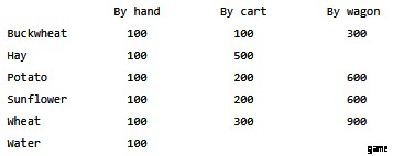 各馬は毎月 25 の干し草または小麦を食べ、25 の水を飲んでいます。他の動物と同様に、動物を生かしておくために厩舎や荷馬車小屋に労働者は必要ありませんが、もちろん、荷馬車小屋に荷馬車を置いても、それを運転する労働者がいなければ意味がありません.