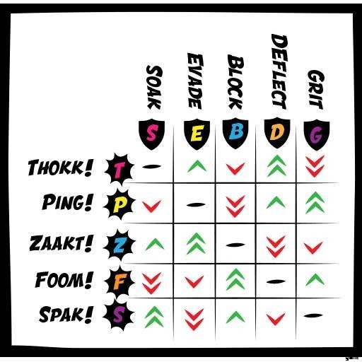 テーマは、じゃんけん方式で攻撃タイプ (thokk、ping、zaakt、foom、spak) と相互作用する 2 つの防御 (浸す、回避する、ブロックする、そらす、グリット) も定義します。たとえば、thokk はたわみには強く、グリットには弱いです。チャートがあります。自分自身を脆弱なままにしないために、また最も効果的な攻撃を選択できるように理解することが不可欠です。ターゲットに複数の防御がある場合、自動的に最適なものが取得されます。一部の攻撃とサポートは、一部の防御タイプを一時的に削除するため、考慮することが重要です。残念ながら、ヒーローの作成時に各テーマの防御をリストしていませんが、その情報はプレイ時に利用できます.