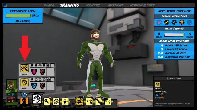 以下は、トレーニング画面のショットです (ヒーローを作成した後に利用できます)。ここに私の 2 つのスタンスがあります。左がガジェット、右がブラスターです。ここではテーマをスタンスと呼びます。赤い矢印は、ガジェットをクリックした場所を指しています。これで、それを 3 番目のスタンス/テーマ (シューター) に変更できます。これにより、私の防御も変更され(実際には1つだけ変更されます)、最初のスタンスのすべてのパワーと能力が変更されます.また、ブラスター スタンスにいくつかの新しいオプションを獲得したことにも注意してください: