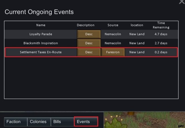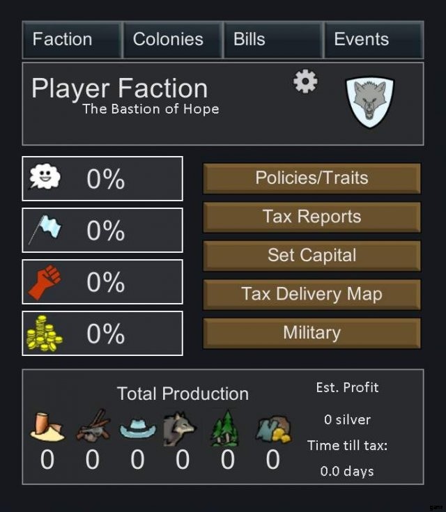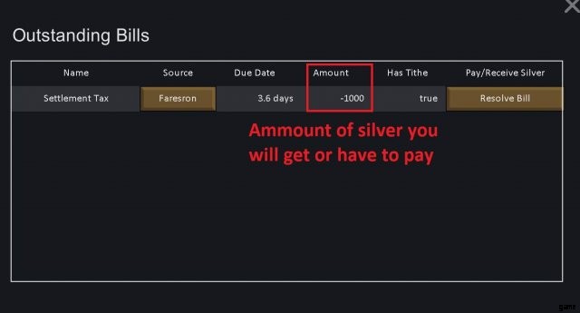 Here you can pay or get your taxes. If you have to pay silver because you have a tithe set up (as seen in the picture), clicking on “Resolve Bill” will take the silver right from your stockpile. At that point the settlement will send you the resources over (same for silver).