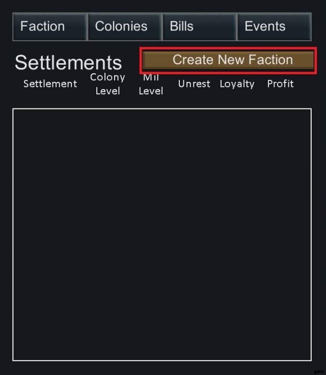 それが終わったら、「コロニー」タブに進み、「新しい派閥の作成」をクリックしてください。