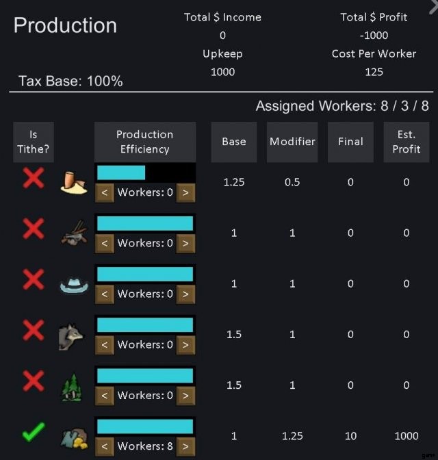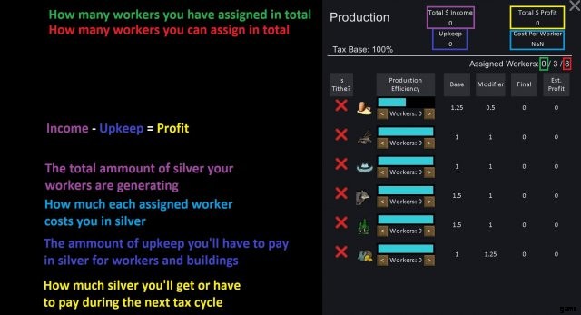 すべてのワーカーは維持費がかかることに注意してください。その維持費は、割り当てた労働者が増えるほど高くなります。 The “Total $ Profit” tells you how much silver you’ll get or have to pay during the next tax cycle.