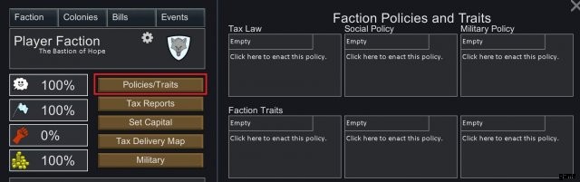 In order to set these up you have to head to your faction tab and click on “Policies/Traits”.
