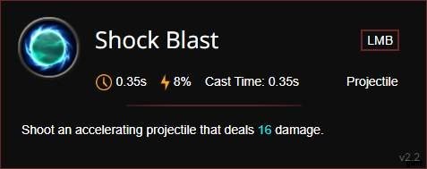ショック ブラストは、基本攻撃としてカウントされているにもかかわらず、主なダメージ源であり、16 ダメージという少し高い量を与え、他の多くの発射体タイプの基本攻撃に比べてキャスト タイム クールダウンが長いです。