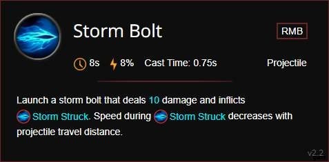 ストーム ボルトはあなたの最強の無効化能力です。ストーム ボルトは 10 という非常に低いダメージを与えますが、敵を 1.5 秒間一掃することができます。敵が一掃されている間、20 以上のダメージを受けるとストームストラック デバフが除去されます。