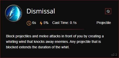 Dismissal は、投射物と近接イニシエーターが嫌う能力であり、Dismissal を敵に当てると即座に敵を投げ捨て、敵の投射物が Dismissal に遭遇すると消滅します。