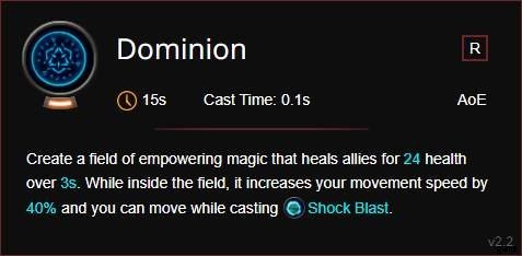 ドミニオンは、他の元アビリティよりも頻繁に使用したいアビリティです。スキルショットではなく、味方と自分の両方のヘルスを回復できます。移動速度のブーストは、敵の発射体の攻撃を回避するのに役立ち、ショック ブラストを制限なくすばやく使用できます。 .