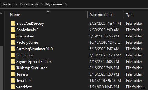 ここで、Terraria を終了して閉じ、Windows のドキュメント フォルダーを開きます。見つからない場合は、Windows キー + R を押して「ドキュメント」と入力すると、Enter キーを押すと開くはずです。次に、「マイ ゲーム」フォルダを探します。