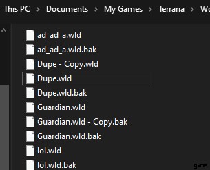 My Games フォルダに入ったら、Terraria の下に移動し、次に Worlds に移動します。ワールドのファイルをコピーして貼り付けます (.bak をコピーする必要はありません)。