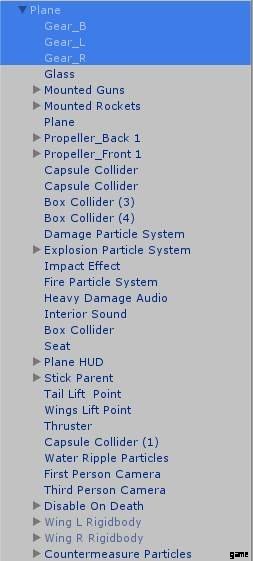 これは、Unity でのストック プレーンの階層です。着陸装置は Blender にあった名前が付けられており、飛行機の機体などに隠れていません。