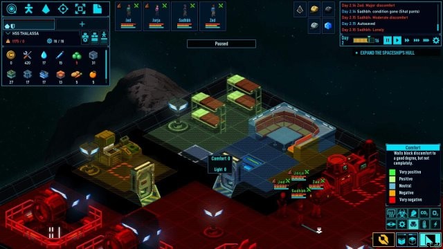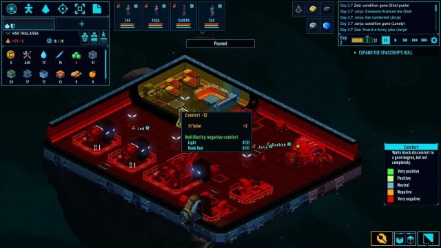 ここでは、このステーションのほとんどが非常にネガティブな快適性であることがわかります。私の兵舎はわずかに良好な状態です。トイレは部屋にマイナスのスコアを追加するようです。それを動かして、部屋の快適さを改善してみましょう。