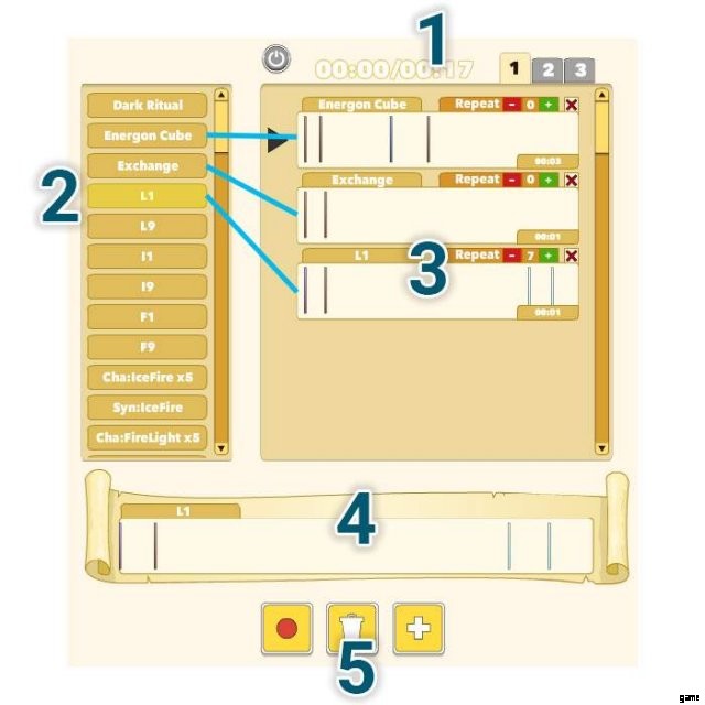 記録をローテーションにドラッグすると、それらが互いに積み重ねられているのがわかります。それらはその順序で実行されます。次の呪文に進む前に、必要に応じて特定の呪文を数回繰り返すことができる小さな数字が表示されます。この例では、ローテーションは次のようになります: