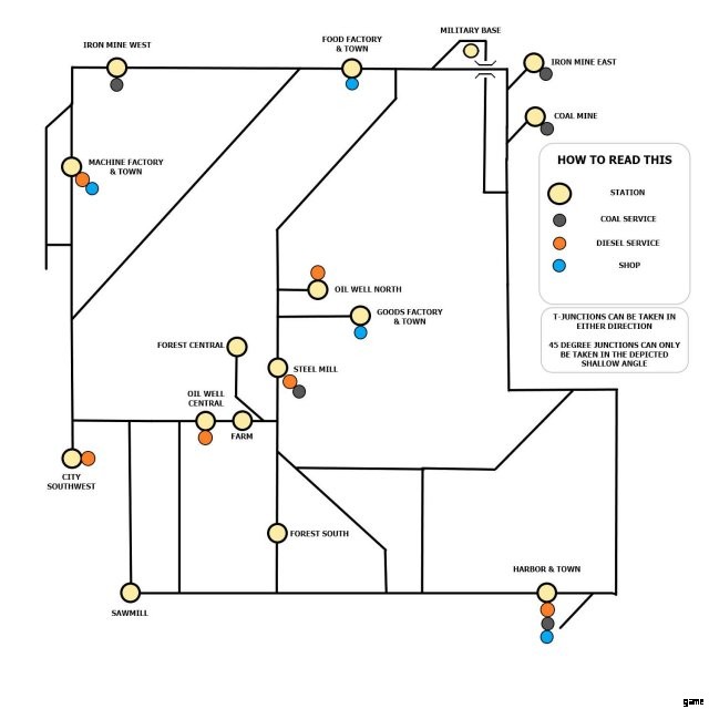 あなたが私のような人なら、「左、左、右、左、左」のようにルートを覚えるかもしれません。ゲーム内の美しいマップを解読しようとすると、石炭をかき集めたり、脱線しないように懸命に努力したりするときに、少しストレスがたまることがあります。すべてのジャンクションを含む世界地図のこの概略図と、方向転換できるかどうかが役立つかもしれません。
