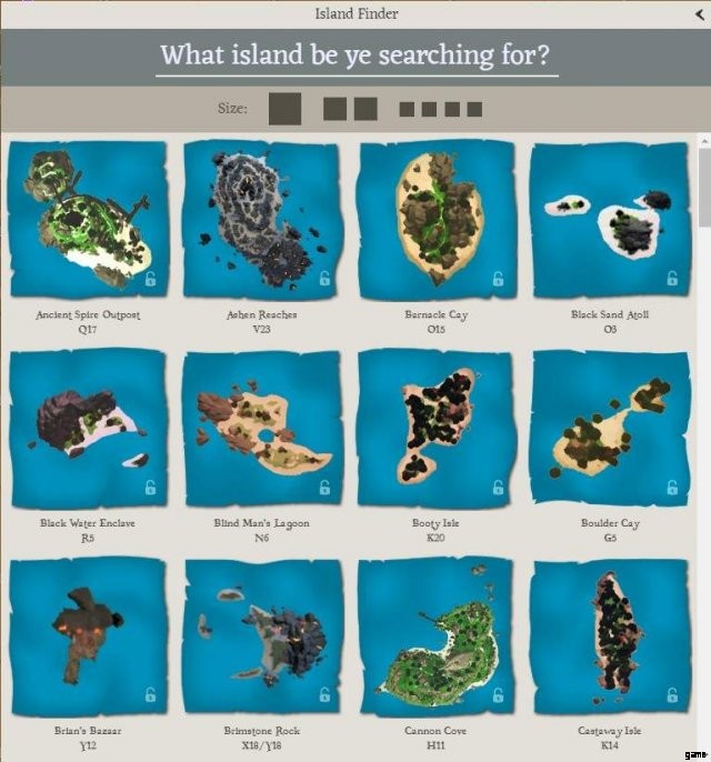 検索オプションに「chicken isle」と入力して結果から選択するだけで、島の場所が表示されます。宝の地図に名前のない島の写真だけが含まれている場合は、島の写真のリスト (メニューの 3 番目のボタン) を使用すると、より簡単に見つけることができます。各島の絵の下に座標を書き留めて、船の地図で見つけてください。