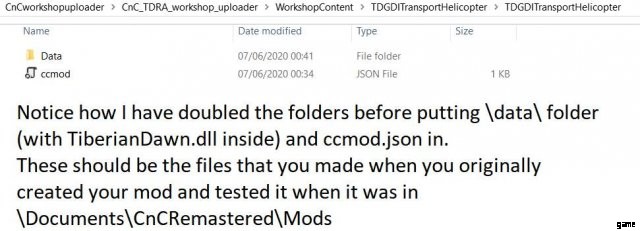 アップローダープログラムが作ったフォルダの中に、同じ名前の別のフォルダを作ります。その追加フォルダーに、ccmod.json ファイルのコピーと、TiberianDawn.dll を含むデータ フォルダーを挿入します。