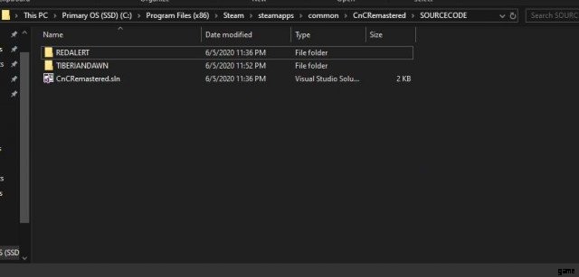 Visual Studio をインストールしたら、ソース コード フォルダーに移動し、「CnCRemastered.sln」という名前のファイルを見つけます。