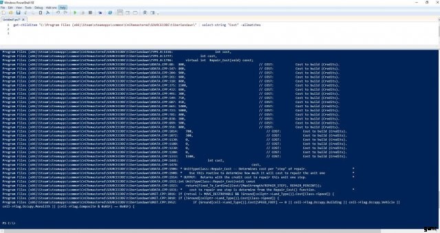 - get-childitem “C:Program Files (x86)Steamsteamappscommon CnCRemasteredSOURCECODEtiberiandawn” | select-string “Cost” -allmatches