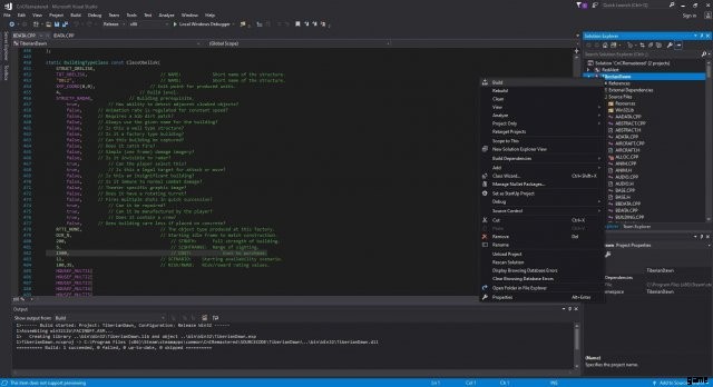 Visual Studio で、右側のメニューの [ソリューション] の下にある [Tiberian Dawn] を右クリックし、[ビルド] を選択します。
