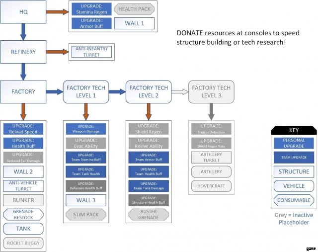 最初は、いくつかのアップグレードしか利用できません。工場の建設が完了すると、技術 1 と技術 2 の研究が完了すると、さらにロックが解除されます。アップグレードにより、生存性とダメージ出力が大幅に向上します。