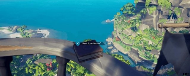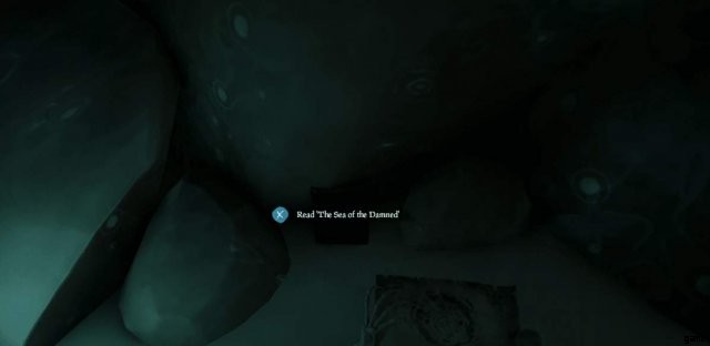 6.池の滝に向かって歩いたり泳いだりして、洞窟に入ります。道に沿って読むための「The Sea of the Damned」という名前の日誌があります。地図を持った骸骨の手の後ろに座っています。