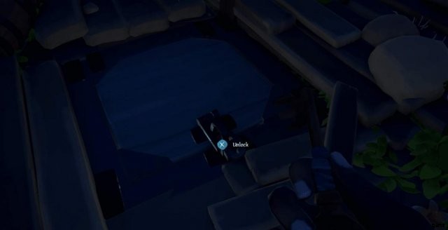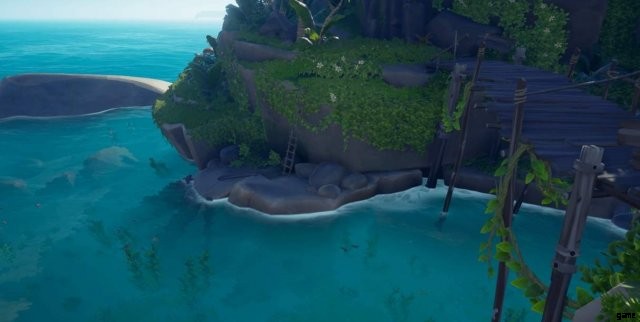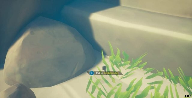 16.難破した陸上船の上部に向かい、錨を見つけます。階段に向かって左折し、苔むした橋を渡って池へ。池には、掛け金を開ける鍵があります。鍵「オールド セーラーズ キー」は水中にあり、石の岩壁の近くにあり、そこで拾います。