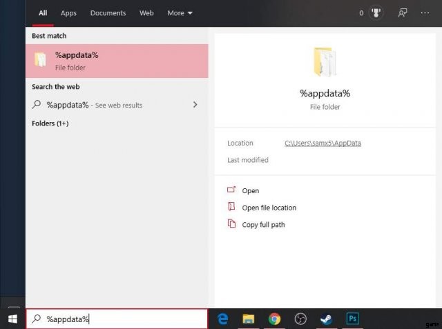 これを行うには、左下の検索バーに %appdata% と入力し、表示されるフォルダーをクリックします。