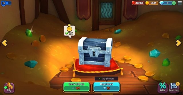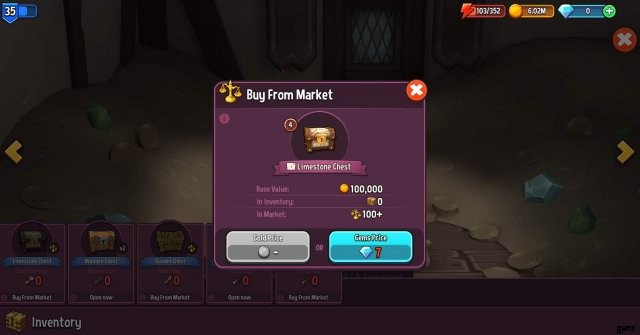 トリックを行うのに十分なジェムがありますか?素晴らしい!!次に、「都市」ボタンをクリックして都市に移動する必要があります。そのクリックをクリックすると、「Market」と「Guild」の間にあるはずの「Chest」。その後、この画面に移動します。