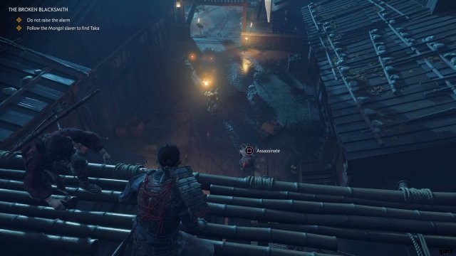 目の前の家に着いたら、建物の上に登り、屋根を使ってモンゴルの奴隷商人の後を追います。