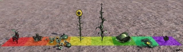 左から右へ:チリ、ニンジン、カボチャ、ヒマワリ、トウモロコシ、キャベツ、キュウリ、ビーツ。