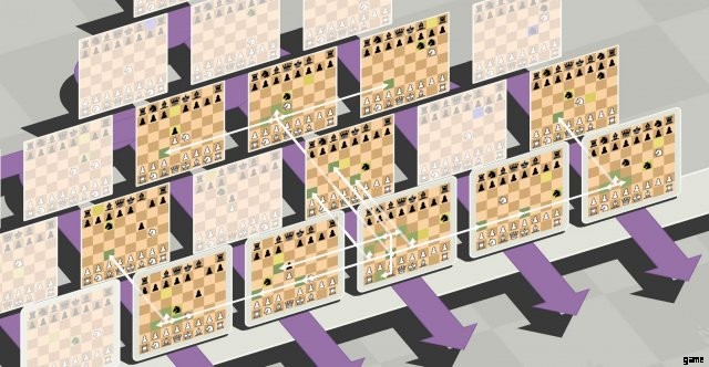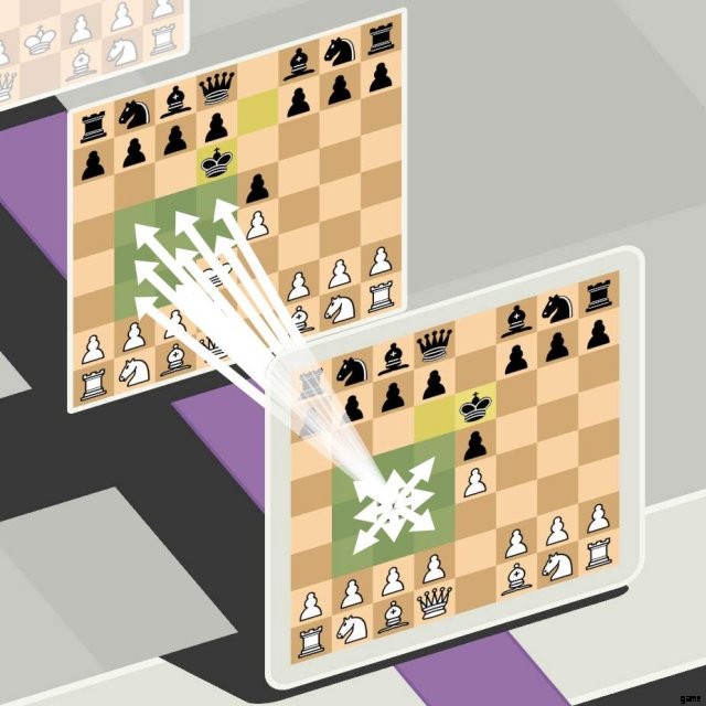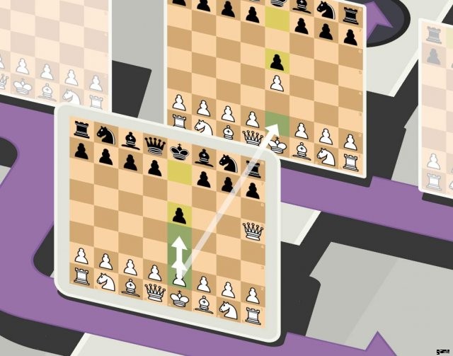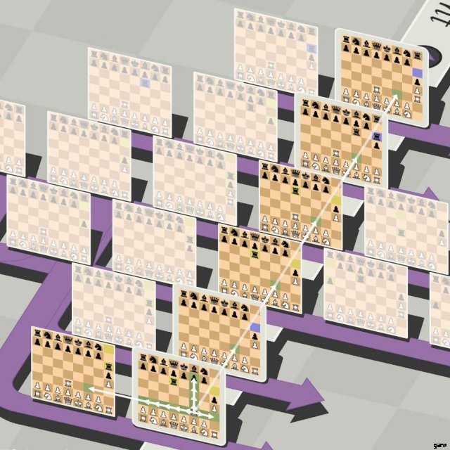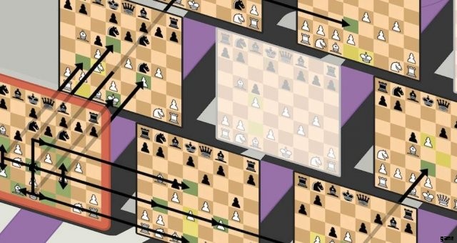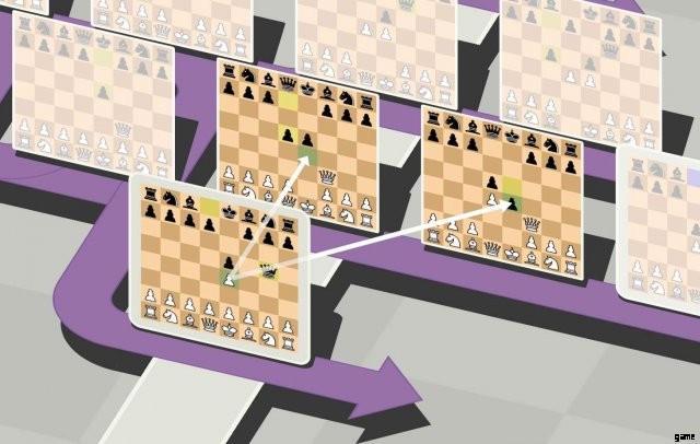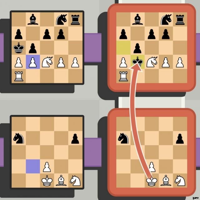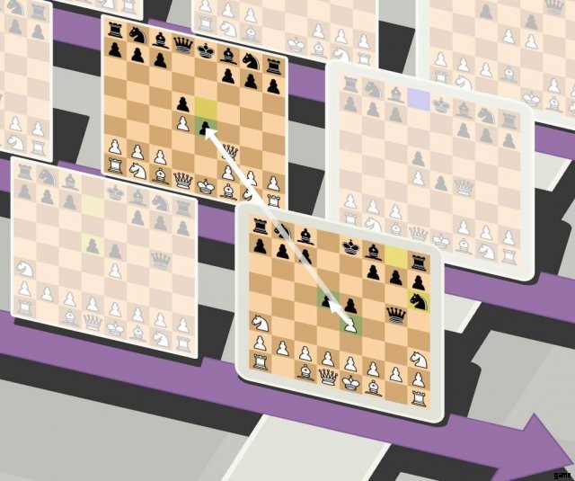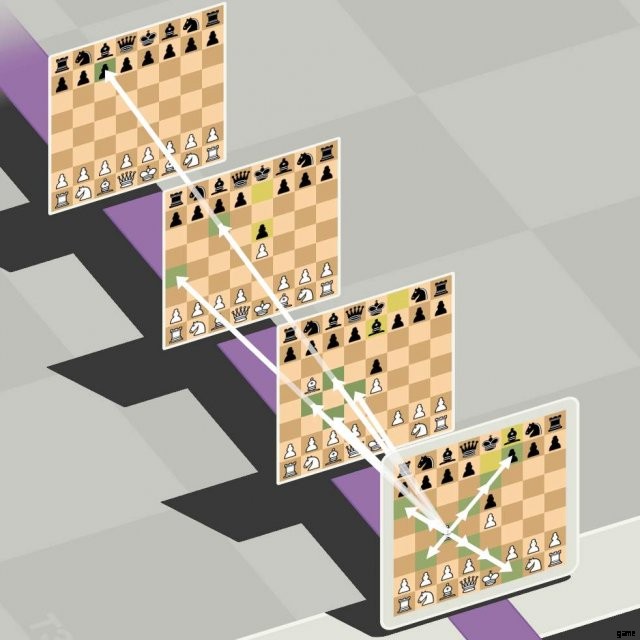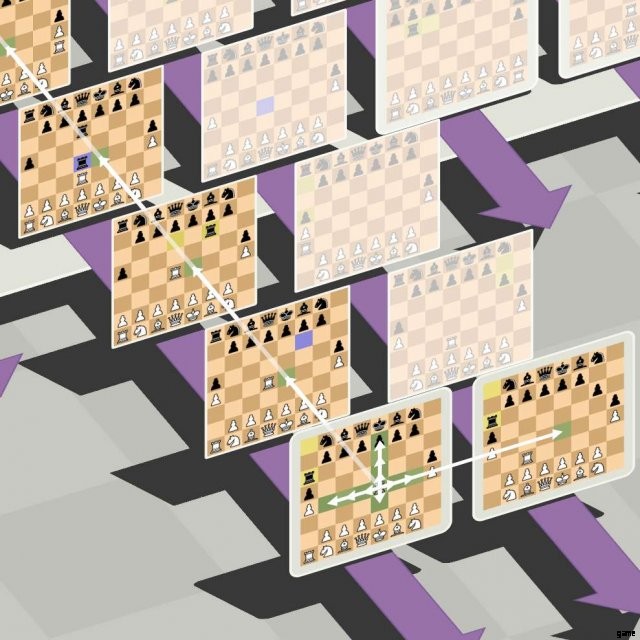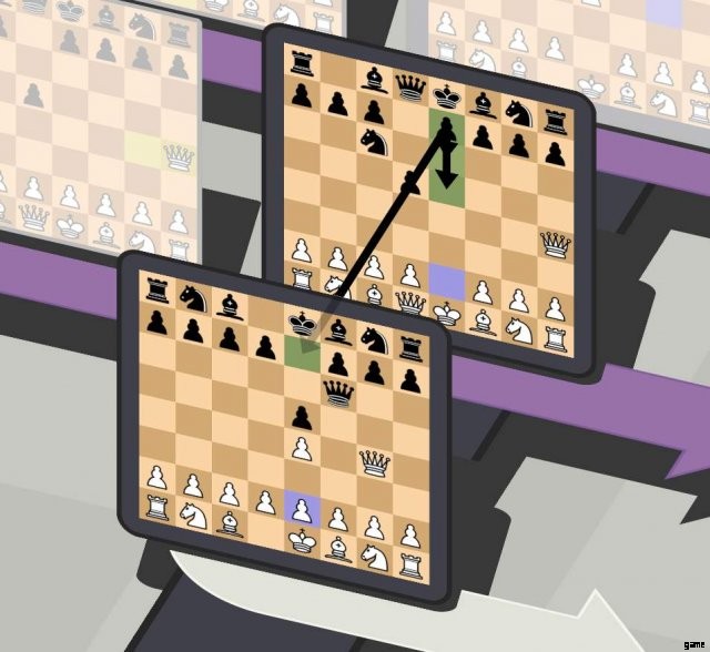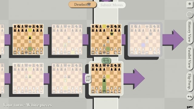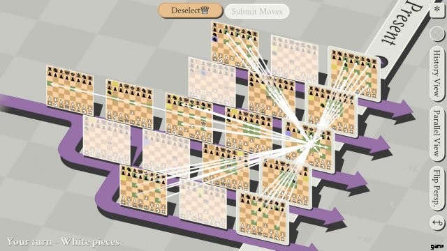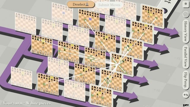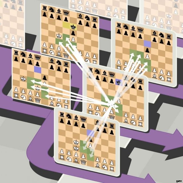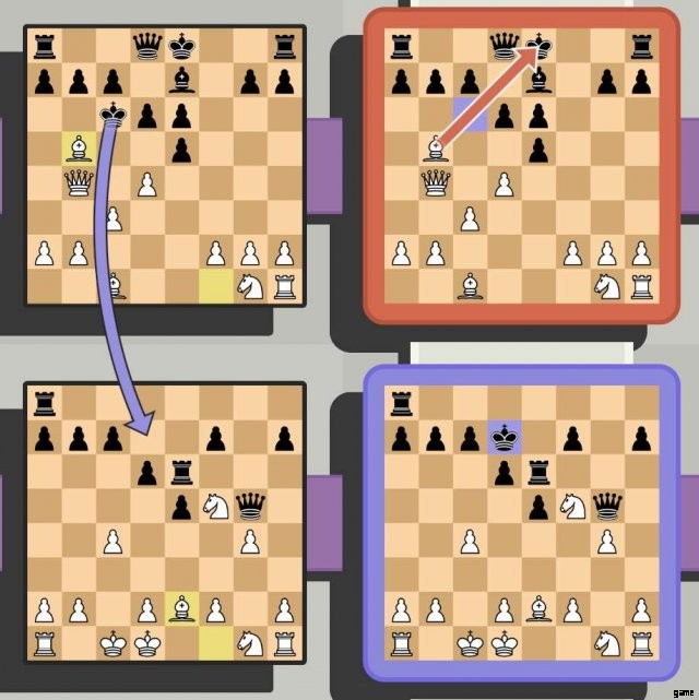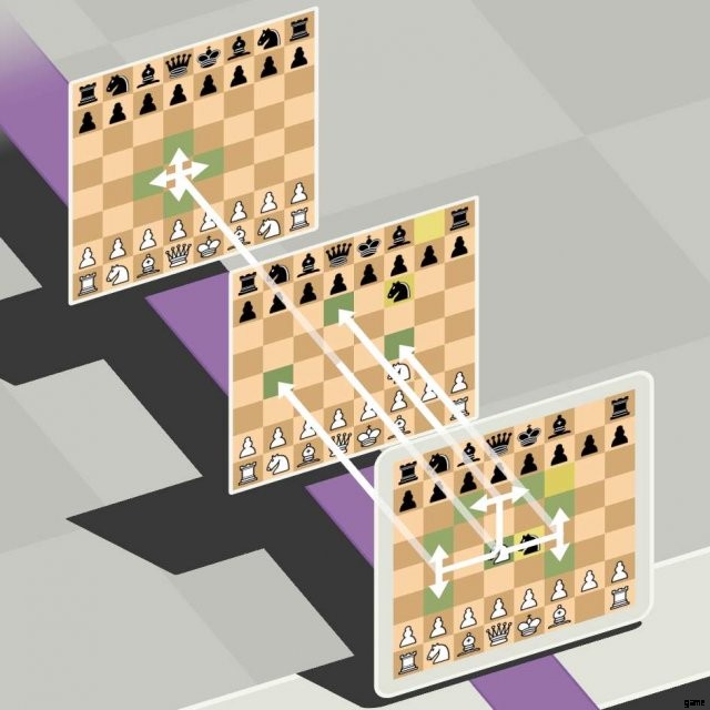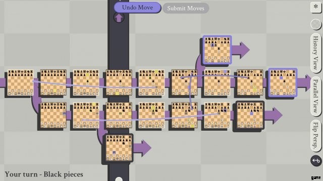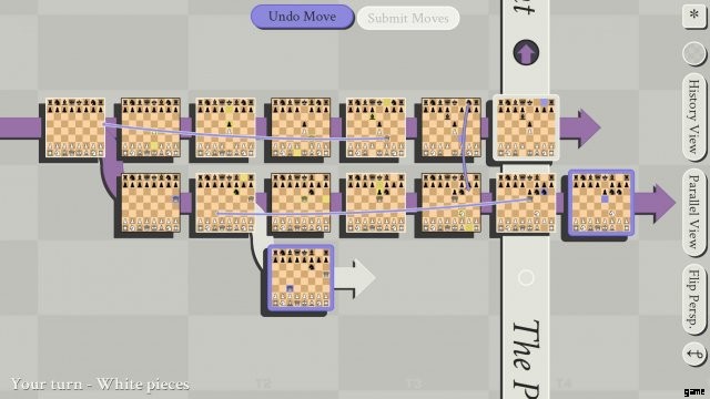 しかし、対戦相手が戻る前にプレイヤーが駒を 2 回戻した場合 (現在のボードから現在の別のボードへの移動はカウントされません)、「現在」はその新しいタイムラインで戻ることはなく、その新しいタイムラインは通常の紫色の矢印の代わりに、下に白/黒の矢印が付いています。これは、対戦相手が「現在」を戻すまで続きます。つまり、過去にある余分なタイムラインのみを作成します。対戦相手は、それらの余分なタイムラインでプレイする必要はありません。逆の場合は、プレイヤーもプレイする必要はありません。対戦相手が過去のどこかに新しいタイムラインを作成すると、そのときだけ「現在」が最も古いタイムラインにシフトします。これにより、下にある「エクストラ」タイムラインの矢印も白/黒から紫に変わります。