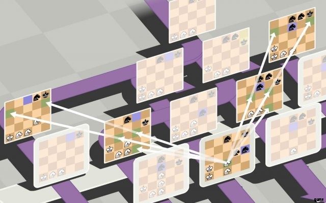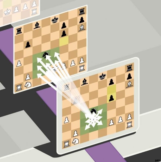 古典的なチェスの動きと同様に、タイムラインを通る騎士の動きは同様の L 字型をしています。また、パス上のピースを飛び越える能力と同様に、5D ナイトは、自分の色が目的地を妨げていない限り、障害物について心配する必要はありません。