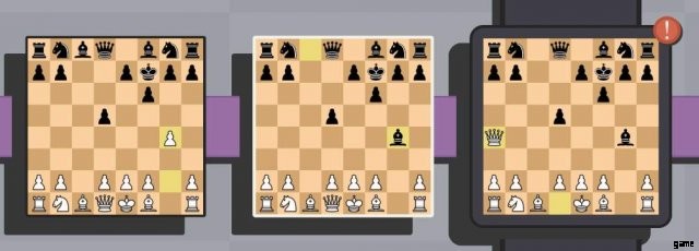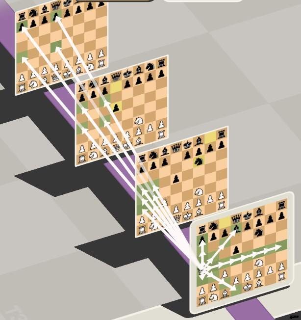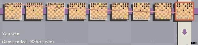 上記の最後の手は、通常のチェスではチェックではありませんが、5D では勝利の手です。これは、クイーンがはるか昔にキングを攻撃しているためです。