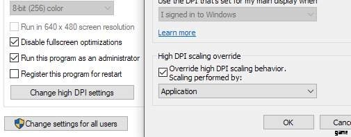 - [高 Dpi の変更] に移動し、[高 DPI 何とか何とかアプリをオーバーライド] をオンにします。