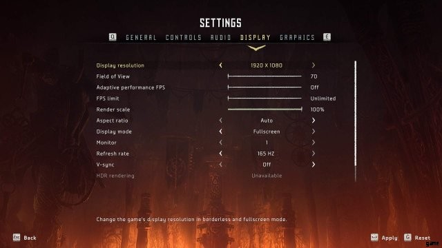 - [ディスプレイ] に移動し、ネイティブ解像度であることと、ディスプレイ モードがフルスクリーンであることを確認します。フルスクリーン モードでは、パフォーマンスが 5 ~ 6% 向上します。レンダリング スケール 100% は、あえて下げることさえしません。リフレッシュ レートは重要ではありません。パッチが適用されるまで、一定の 144 fps を取得することはありません。決して vsync をオンにしないように言ったインターネット上の男を信頼してください。