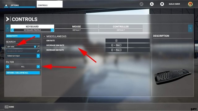 これを「all」検索「sim」または「sim rate」に設定すると、「sim レートを下げる」ボタンと「sim レートを上げる」ボタンを設定する機能が表示されます。