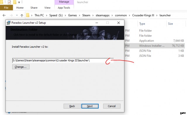 [次へ] をクリックし、インストール パスを launcher-installer-windows.msi が見つかったフォルダーに変更します。次のようになります: