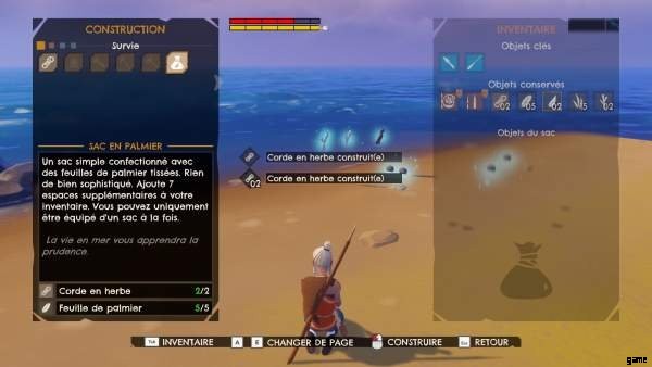 - 2 番目の島に到着したら、地面にあるインベントリを空にして、ヤシの木のバッグを作るために必要なものを集めます。スペースを節約するために、必要なときにロープを作ります。