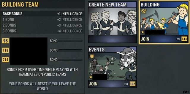 おそらく、Fallout 76 を購入して、「グループに参加するつもりはない!」と思ったことでしょう。ログインするたびに、そうする必要があります。常に参加または開始したいグループは、建物グループです。 4 人で完全なグループになると、+4 int が得られ、多くのボーナス XP が得られます。これらの人々と交流する機会はほとんどありませんが、ボーナス XP はそれだけの価値があります。人々は数値を計算し、建物グループが与えるボーナス int が、イベント グループが与えるイベントからのボーナス XP よりも優れていることを発見しました。ボンドは、人々が参加と脱退を悪用するのを防ぐメカニズムにすぎません。あなたがグループに参加したり、誰かが新しいグループに参加したりすると、絆バーはゆっくりといっぱいになり、最大になると、その人はグループに利益をもたらすことができ、その逆も同様です.また、チームメイトからも無料の特典と無料のファストトラベルの場所を入手できます.グループに参加またはグループを開始するには、マップを開いてソーシャル インターフェースを開きます。