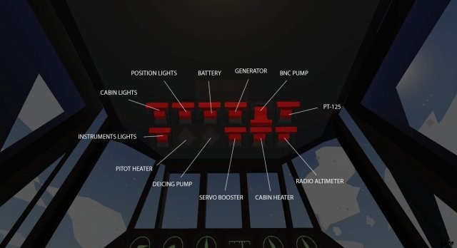 - 電波高度計 – 地面または水面までの高度を 0 ~ 120 メートルの範囲で測定します。ゲージの故障、センサーの故障、電源 (PT-125) の故障の可能性があります。電力を消費します。