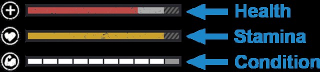 上部の 3 つのバーは、「健康」、「スタミナ」、「状態」を表します。最初の 2 つは自明ですが、「状態」は異なります。