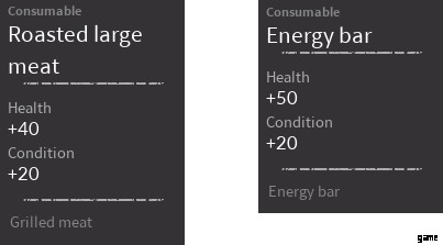 「コンディション」は、最大の「ヘルス」と「スタミナ」を決定します。 「状態」は時間とともに減少しますが、特定の食品を食べることで効果を逆転させ、「状態」を完全に戻すことができます。ほとんどの調理済み食品と「エナジー バー」が機能します。