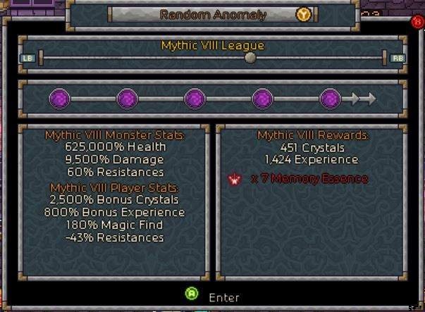 - ランダム アノマリーを選択し、農業を快適に行える神話レベルを選択します。私はミシック 8 を選択しました。これは、ダンジョンで 5 分以内に耕作できるレベルだからです。異常を入力してください。