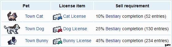 町のペットは、動物学者が販売するペットライセンスアイテムを使用した翌日の夜明け (午前 4 時 30 分) に出現する特別な町の NPC です。プレイヤーの後を追うペットと混同しないでください。町のペットには独特の住宅割り当てバナーがあり、別の NPC と住宅を共有することができます。彼らは、パイロンの要件とエリア内の敵のスポーン率を下げるための NPC としてカウントされますが、他の NPC の幸福度の計算では隣接する NPC としてカウントされず、実際、他の NPC の幸福度にプラスまたはマイナスの影響を与えることはありません。他の NPC とは異なり、町のペットには自衛手段がありません。
