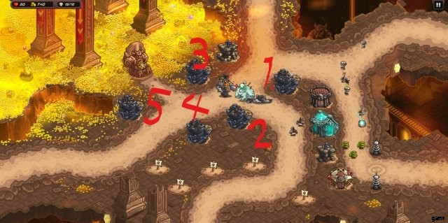 実際のレベルを通過するには、両側に 1 つずつ、2 つのロケット弾を作成します。それらを少なくともレベル3にアップグレードして、弱い敵を1ヒットで倒すことができるようにする必要があります(少なくとも通常および英雄的に)。兵舎で足止めする必要はあまりありません。これらの空間の敵はブロックできませんが、通常の敵もいます。そのため、このステージのすべての敵を攻撃できるヘリオン トライデントもお勧めします。それから、巨大な大群を管理するのを助けるために、より多くのロケットを互いに近くに構築し始めます.必要に応じて、ロケティアを lvl4 にアップグレードし、ニトロ燃料ロケットを 500 個の打ち上げの実績にファームすることもできます。ファーミング ソウル インパクト キルの場合は、大量の敵が 1 か所にいるのを待ち、ソウル インパクトを遠ざけましょう!さらに効率的にグラインドするには、モロクを使用できます。彼のアルティメットは敵を後方に送り、魂への影響を与えるために敵をより適切にグループ化することができ、ハイ ソーサラーにも対処できるからです。