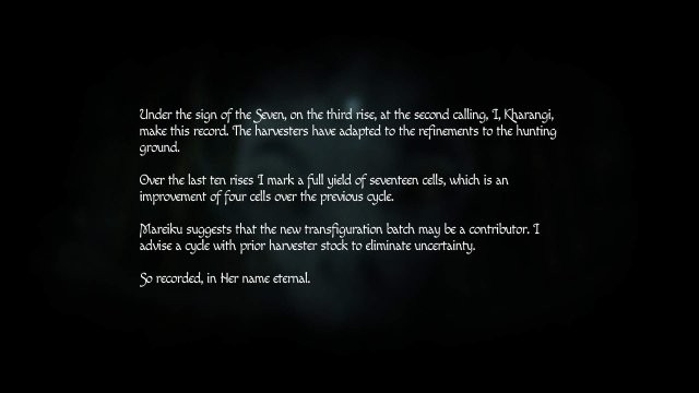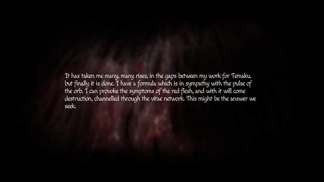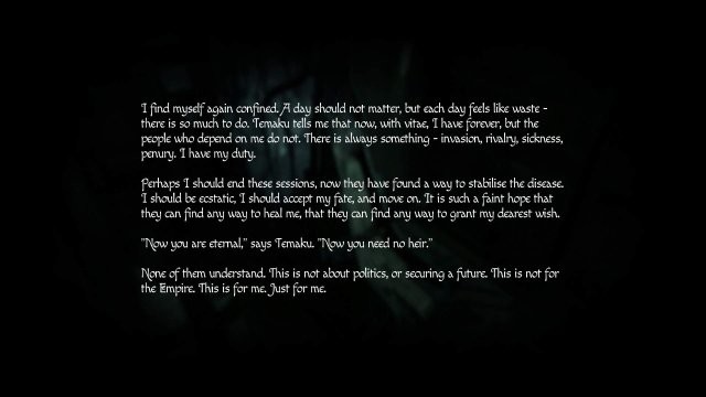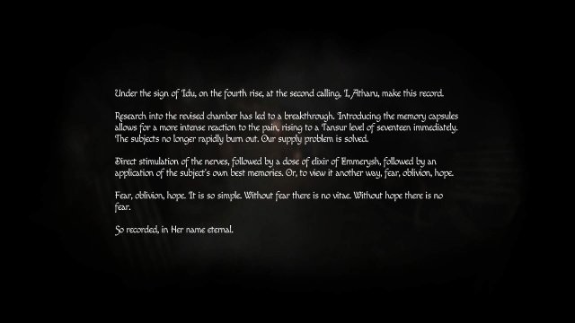 11番目に記録された記憶が近くにあります。履歴書拷問室への電源が入っていないドアを開けて、レベルを正常に進めます。皇后が現れ、胎児の履歴書を作成するようアドバイスします(まだできません)。電源の入っていない別のドアを開けて部屋を出ます。すぐ左に、メモリとタブレットを置く棚があります。