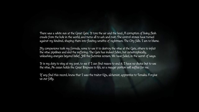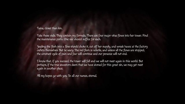 最終的に記録された記憶は、別の廊下の上に赤い四角のシンボルが光っている部屋にあります。あなたが別のフラッシュバックを経験し、タシが皇后との契約を結ぶように提案されたことに気付いた後、あなたは私が言及した廊下の上にある赤い四角のある部屋に入ります.この廊下を下ると、あなたが妨害した保守ポートの前の右側に、最後の記憶が地面に置かれているのが見つかります。